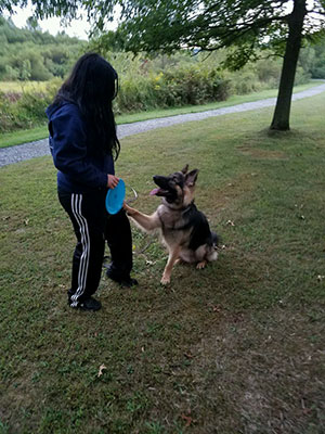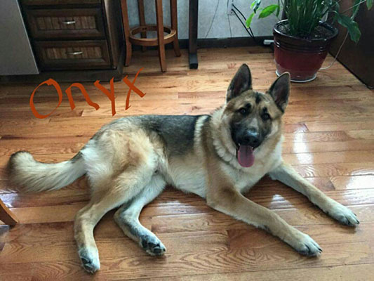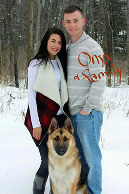 Pictured Below is Onyx with his new family. We got this note from the happy owners: "Hello, My girlfriend and I are the proud owners of one of Misty and Siege's puppies, Onyx. he was from the litter that was born in April 2014. I just wanted to share some pictures with you and tell you that he is the best thing that has ever happened to us. We heard all about how GSD are extremely hyper and destructive and Onyx couldn't be farther from that. He is very mild mannered and has not destroyed anything. He is extremely loving and very attentive. Thank you for allowing us to bring such an amazing animal into our home! Chris